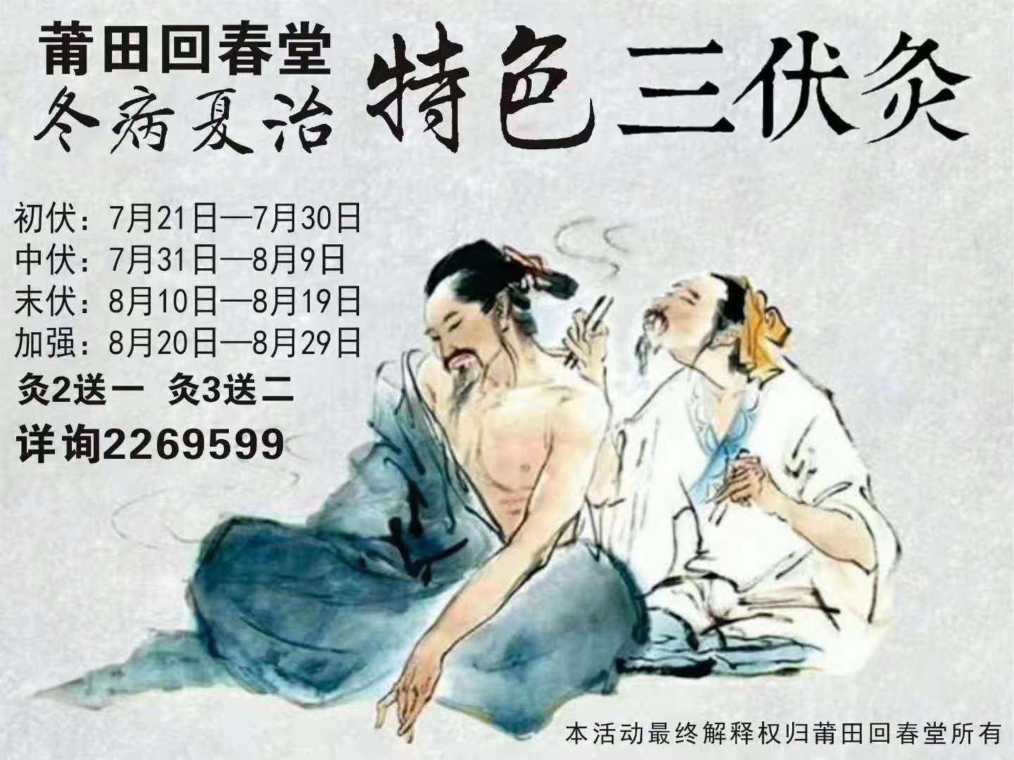 莆田回春堂杏林综合门诊部2021年三伏灸即将开灸,欢迎广大市民朋友提前预约。三伏灸预约电话0594-2269599,或者添加微信HCT_jkzl进行预约。提前预约三人可减免一人费用,提前预约五人可减免两人费用哦。