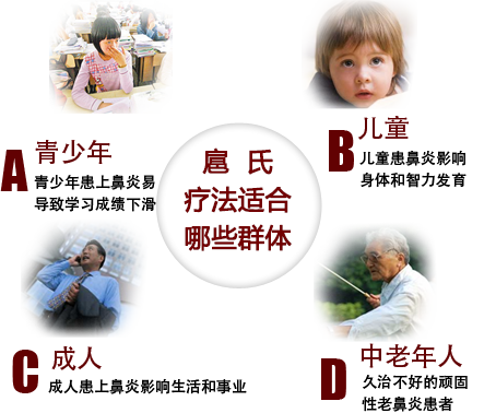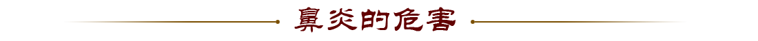 | 慢性鼻炎 | 鼻塞较重,鼻涕脓性。咳嗦多痰,头痛头胀、神经痛、嗅觉失灵、神疲乏力、胸闷气短、记忆力减退、 严重:用嘴呼吸、睡眠中窒息死亡、鼻窦癌变 |