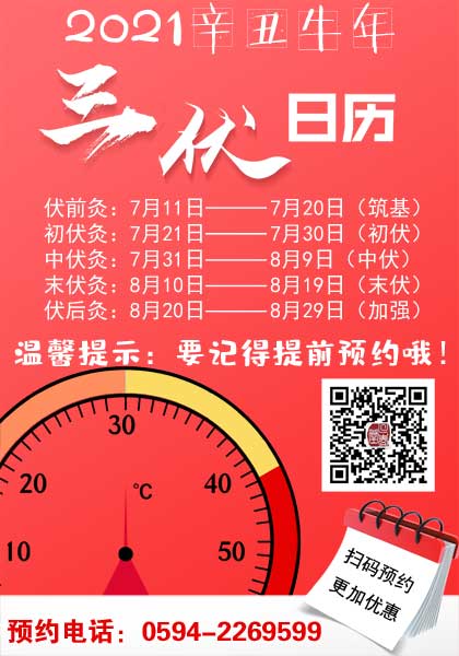 福建省莆田市荔城区回春堂杏林综合门诊部温馨提醒:2021年的三伏灸从2021年7月21日正式开始,到伏后灸8月19日结束。如果是想要做三伏灸,请通过三伏灸专线0594-2269599提前预约,具体时间可以参详下面的2021年三伏灸时间表。