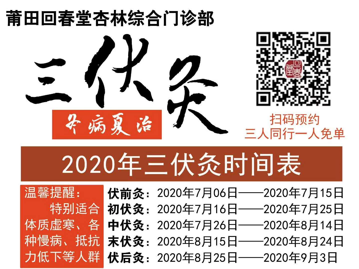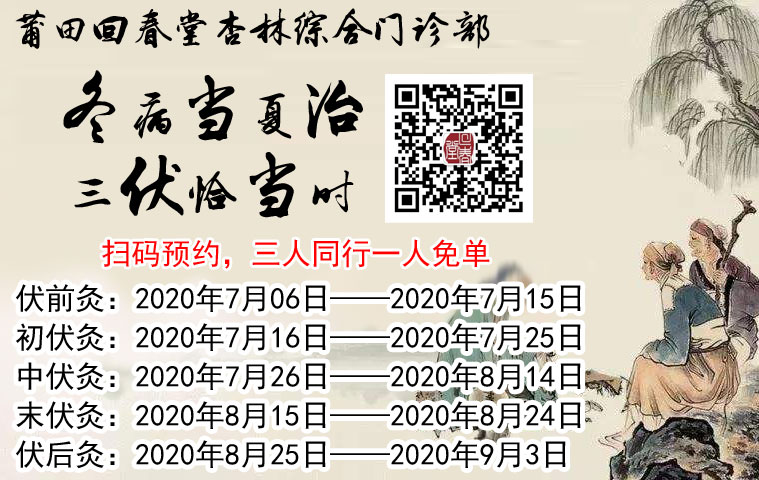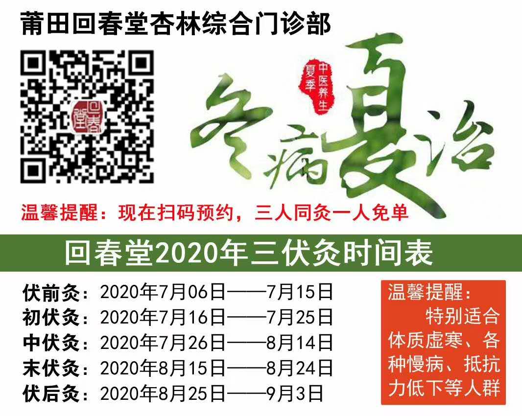 福建省莆田市回春堂杏林综合门诊部2020年三伏灸即将开始。即日起可携带就诊卡现场预约,或添加微信HCT_jkzl,或拨打电话0594-2269599进行预约。
